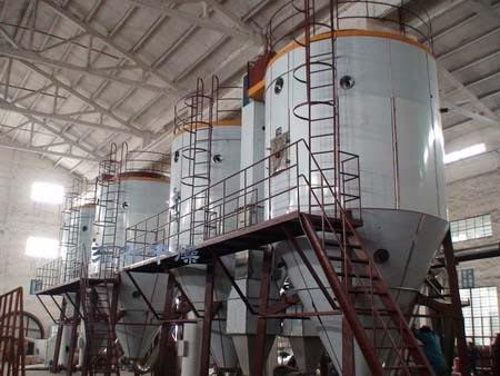 2. Po filtravimo ir šildymo oras patenka į oro skirstytuvą, esantį džiovintuvo viršuje, karštas oras spirale tolygiai patenka į džiovinimo kamerą. Medžiagos skystis per greitaeigį išcentrinį purkštuvą, esantį ant bokšto korpuso, (sukantis) purškiamas į labai smulkų rūko skystį, kontaktuojant su karštu oru ir per labai trumpą laiką gali išdžiūti kaip gatavi produktai. Gatavi produktai nuolat išleidžiami iš džiovinimo bokšto apačios ir ciklono separatoriaus, išmetimo ventiliatoriumi išleidžiant orą.